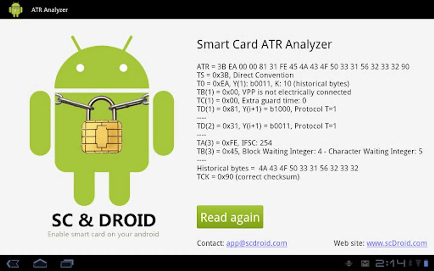 Install the app and plug the smart card reader to android. If your reader supports CCID, a permission dialog popup by android to acquire user's confirmation to access the reader. Click OK to run the app and insert any ISO7816 smart card (should be T=1 or T=0). ATR analyzer will read the Answer to Reset (ATR) from card and analyzer the ISO7816-3 information.