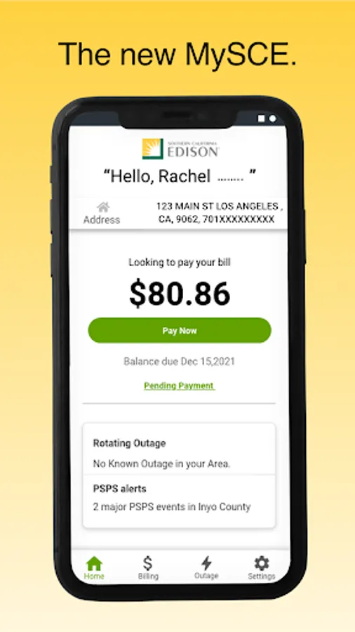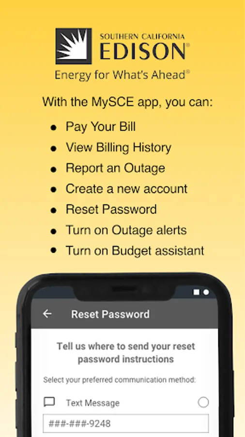 The MySCE app makes it easy to manage your SCE residential account from any mobile device. You can pay your bill, report an outage, check outage status by address, and more.