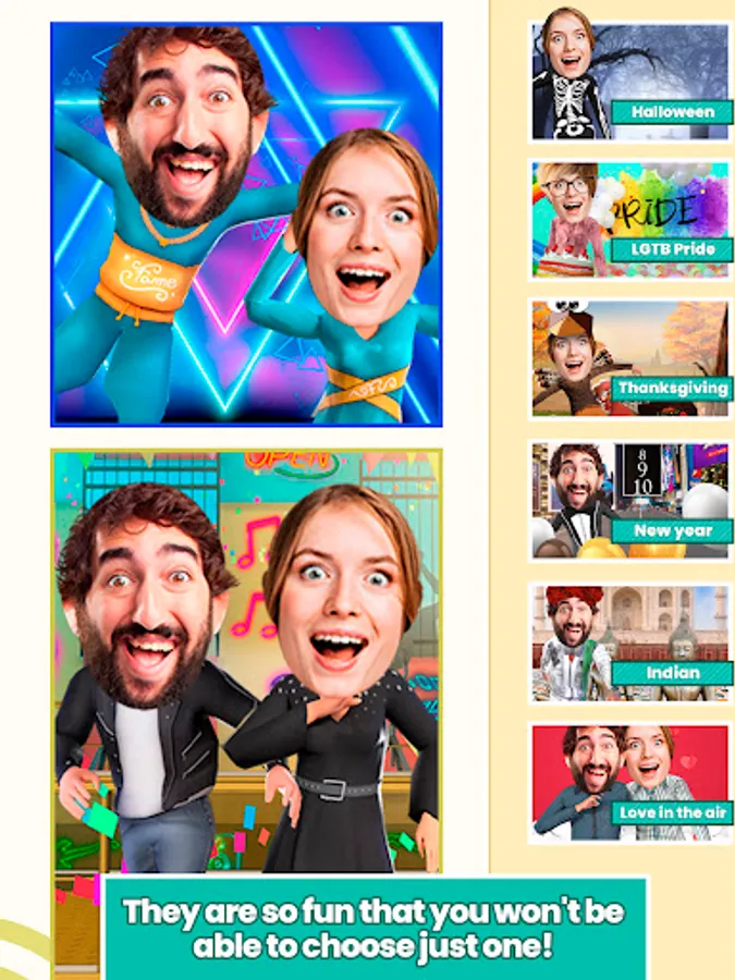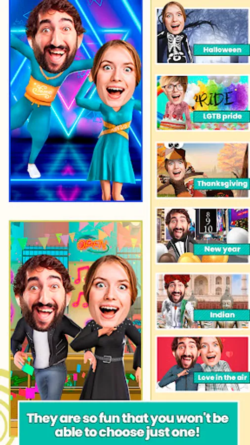 Whatever kind of dancer you are, you can find a funny dance move to suit yourself. Check out the list of the funny dances in the app, enjoy different themes to dance such as love, Halloween, Gay Pride Celebration, Winter Wonderland, Thanksgiving Turkey Dance, Christmas, Saint Patrick’s Day, Summer time, Winner’s Dance, Birthday Celebration and Naughty Moves!