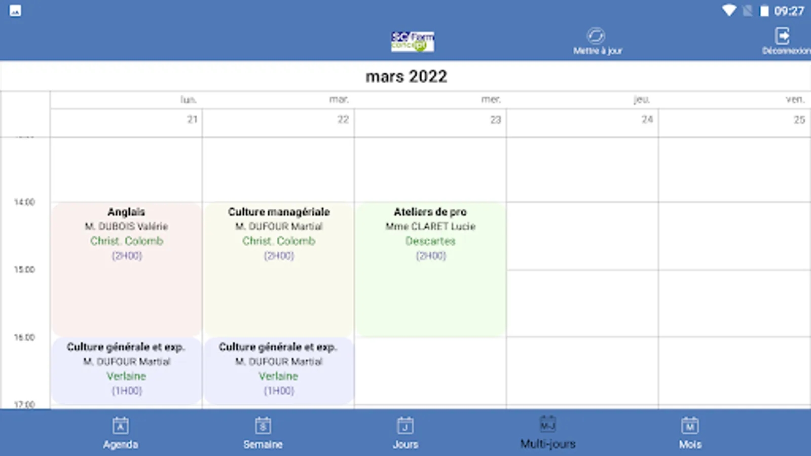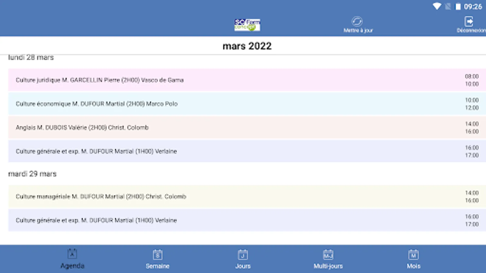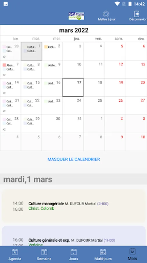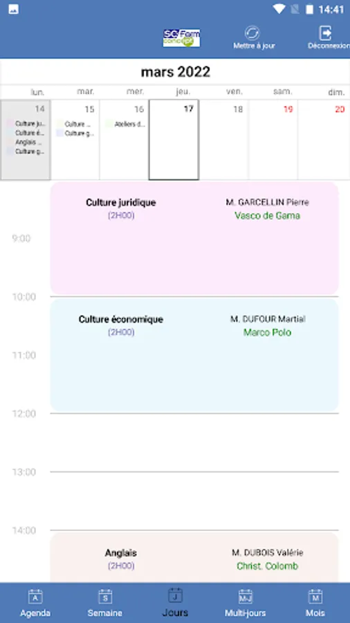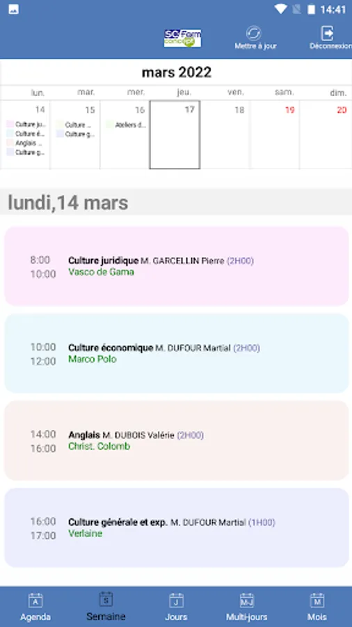 Agenda of trainees and speakers from training centers using SC-Form GALIA, GESSICA or SOFIA software.