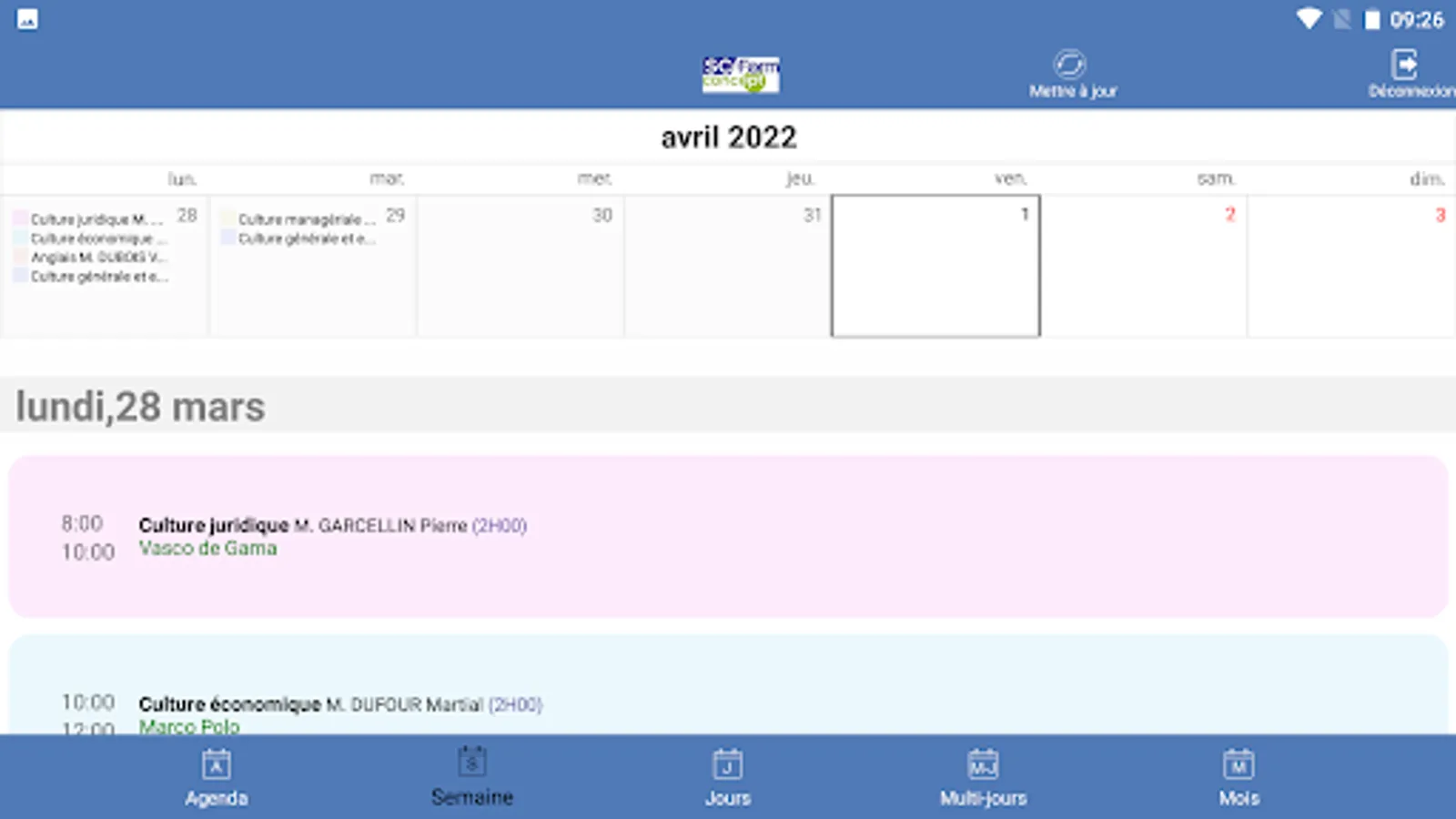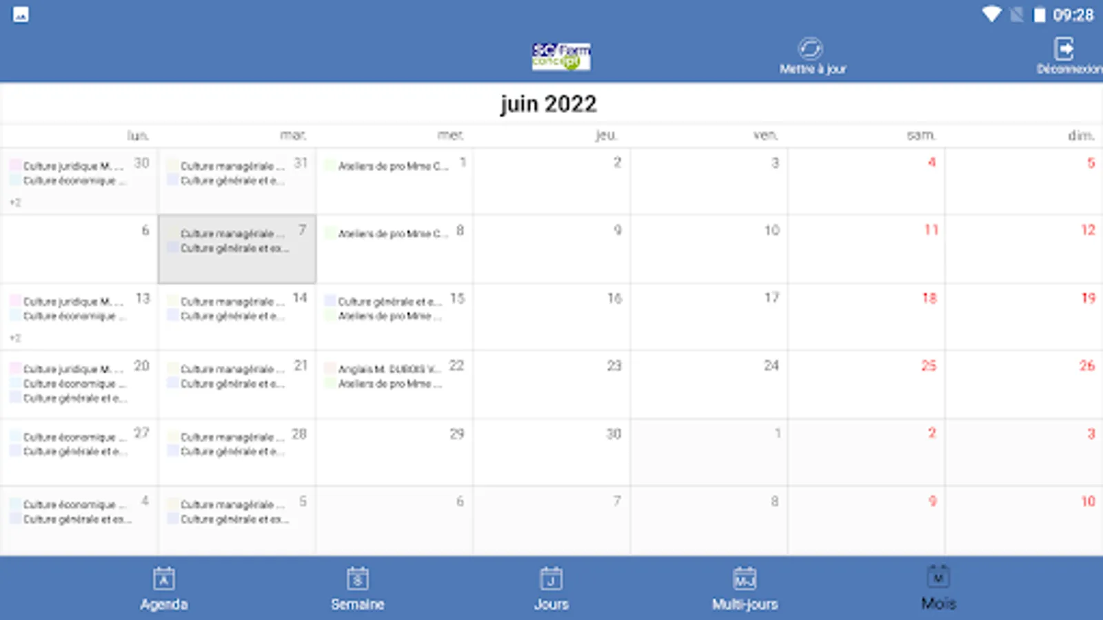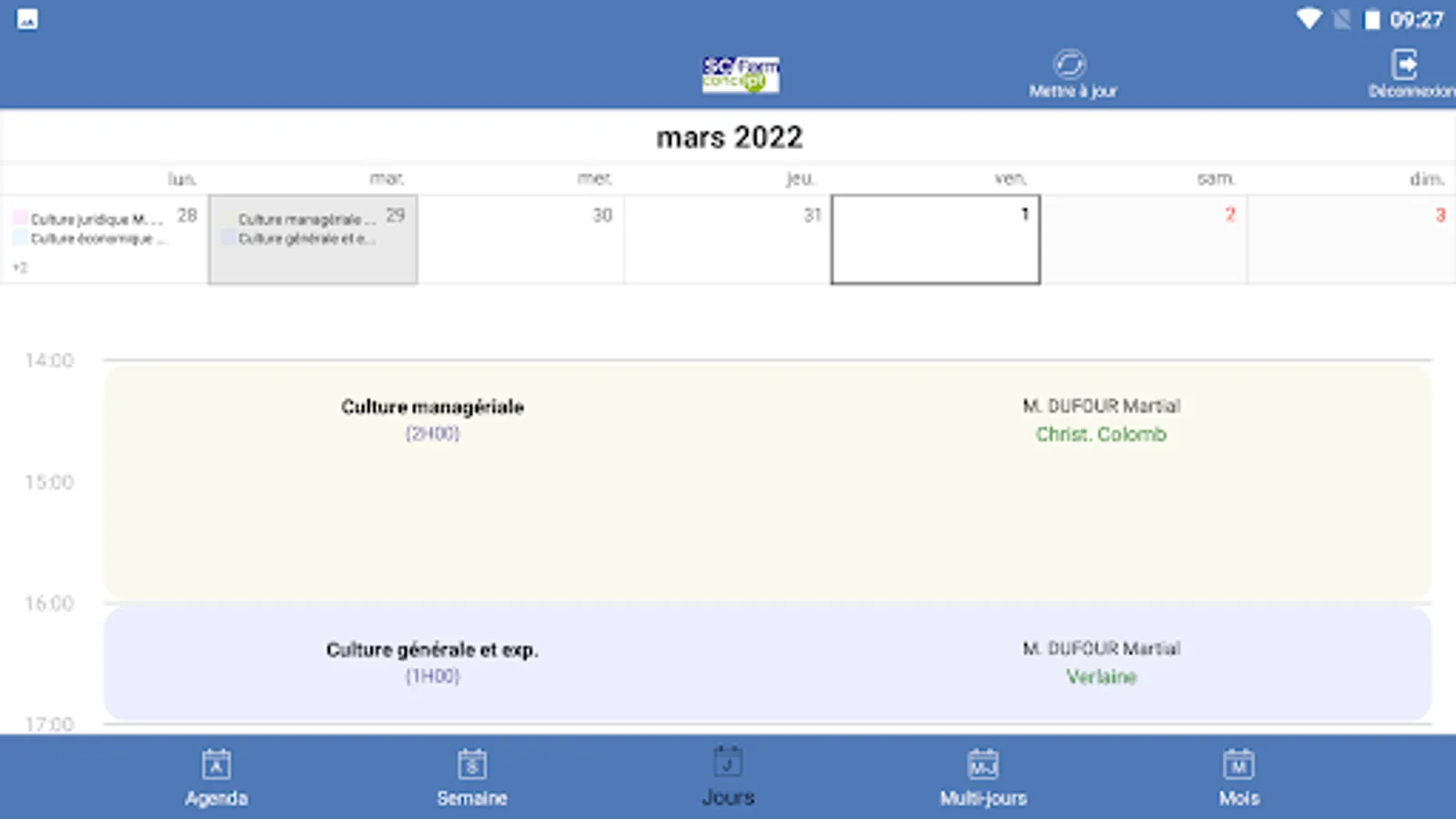 Agenda of trainees and speakers from training centers using SC-Form GALIA, GESSICA or SOFIA software.