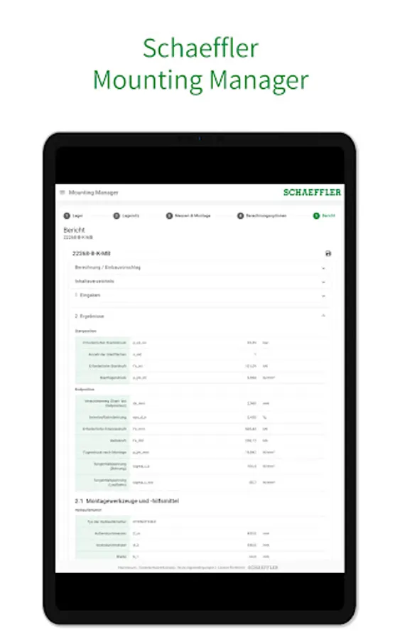 The Schaeffler Mounting Manager comfortably assists in selecting the right bearing installation and offers following possibilities: shows various mechanical and hydraulic procedures, calculates required installation parameters, gives useful installation hints, creates a list of required accessories and tools