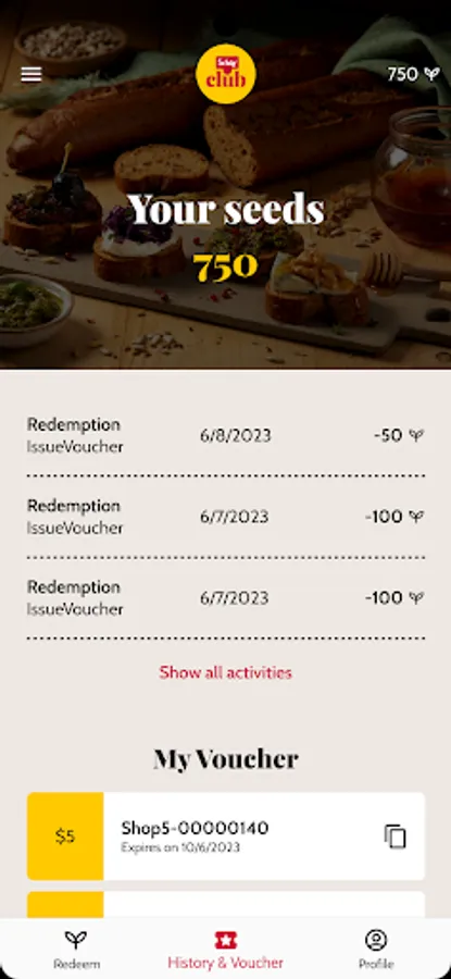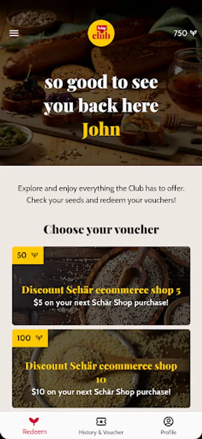 Keep track of your Schär Club seeds, redeem them for vouchers directly in the app and enjoy exclusive benefits.