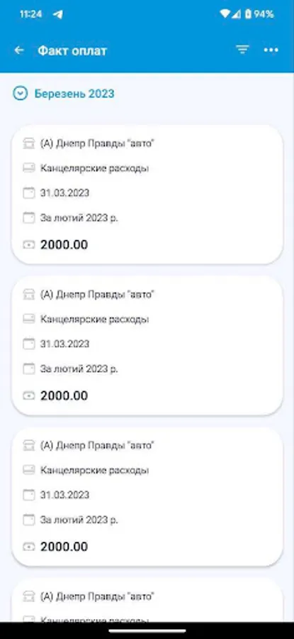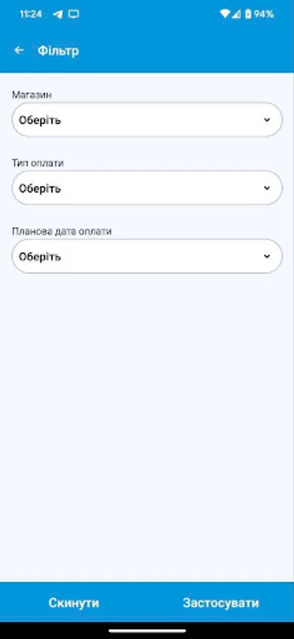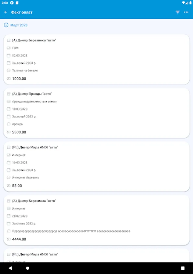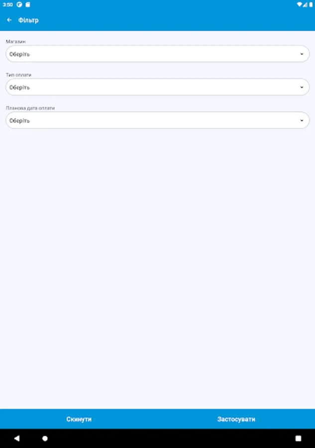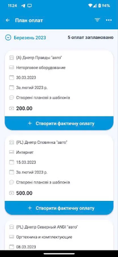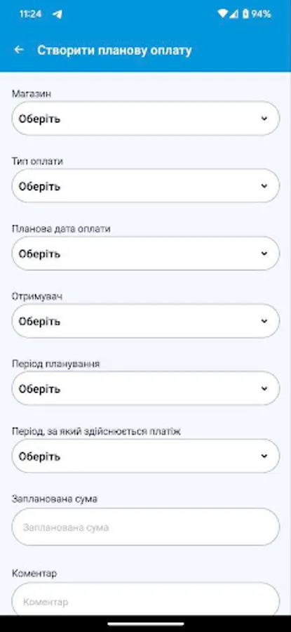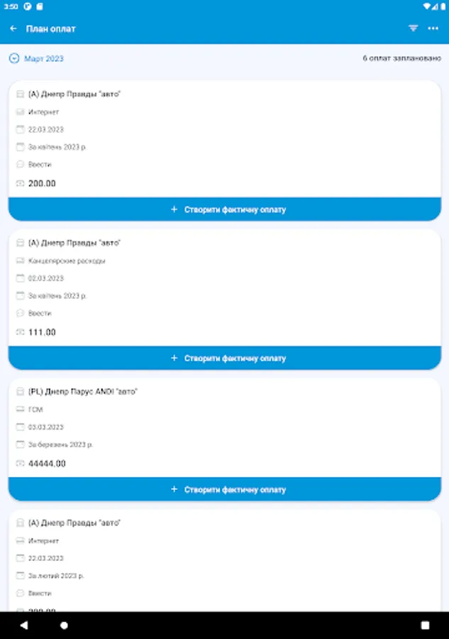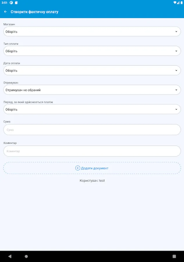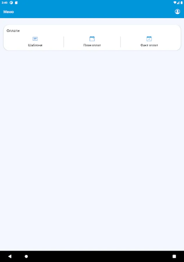 На цьому етапі додаток призначений для автоматизації процесу планування та обліку платежів торгових точок компанії. Він дозволяє формувати шаблони оплат, календар оплат і вносити факт з передачею підтверджуючих документів для аналізу та обробки в центральному офісі.