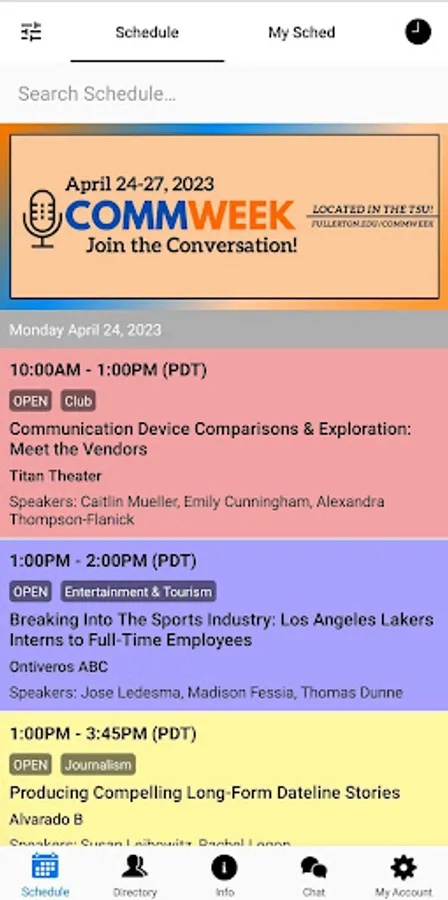 Conveniently browse the entire schedule for CSUF Comm Week 2023. Get the key information of your event without ever having to crack open an event guide.