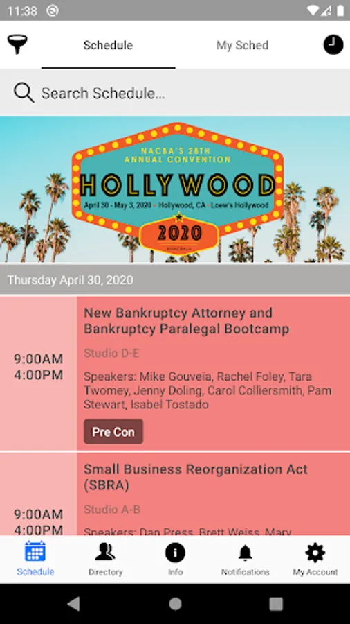 Browse the entire schedule for NACBA's 28th Annual Convention. You can filter by color-coded types, venues or search for what you need. Get the full details of every event without having to crack open an event guide.