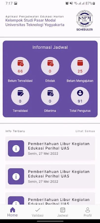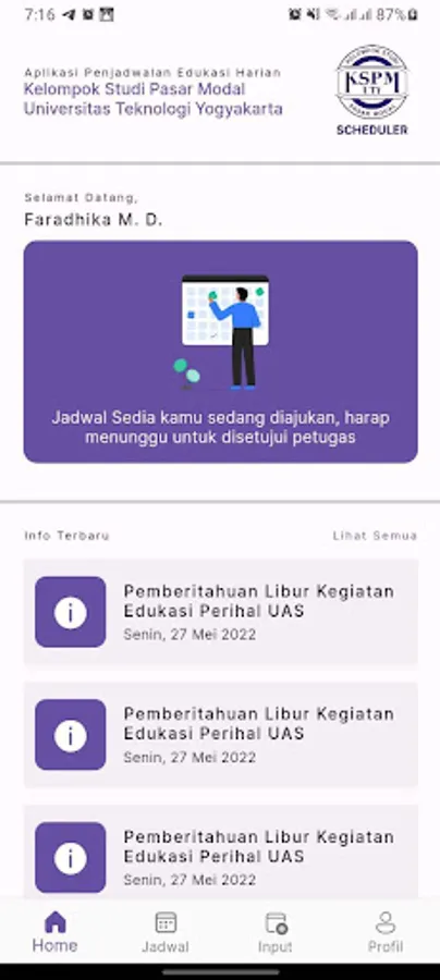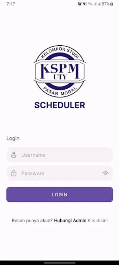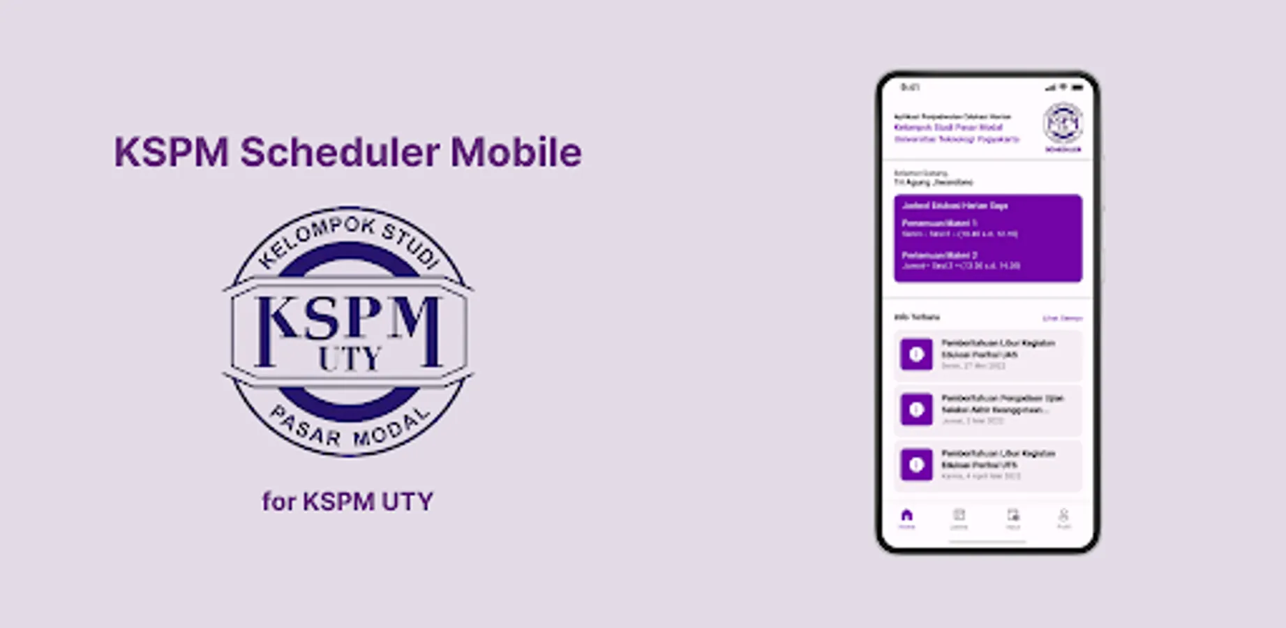KSPM Scheduler is an application specifically for members of the Capital Market Study Group, Yogyakarta University of Technology, in one of its activities, namely Daily Education activities. This application is used to schedule members in Daily Education activities. This application is not used for public.