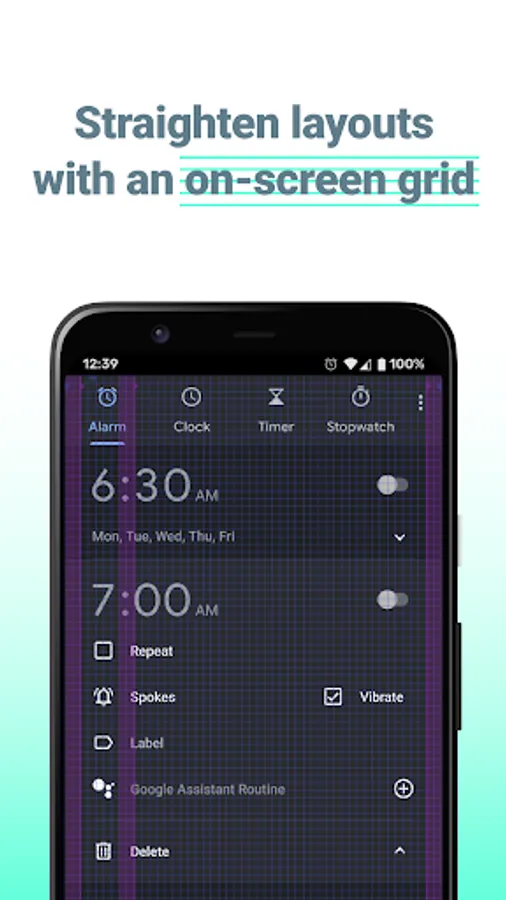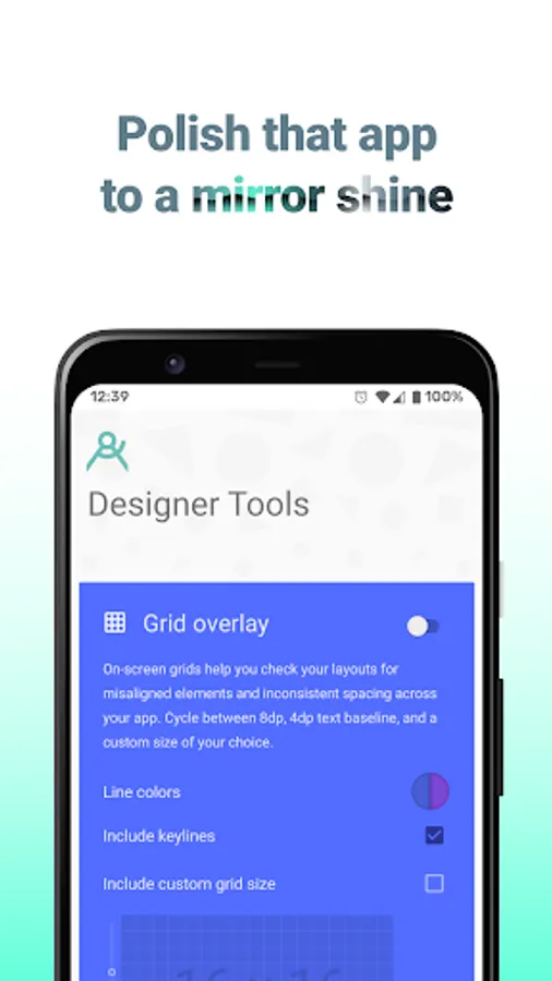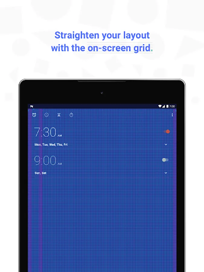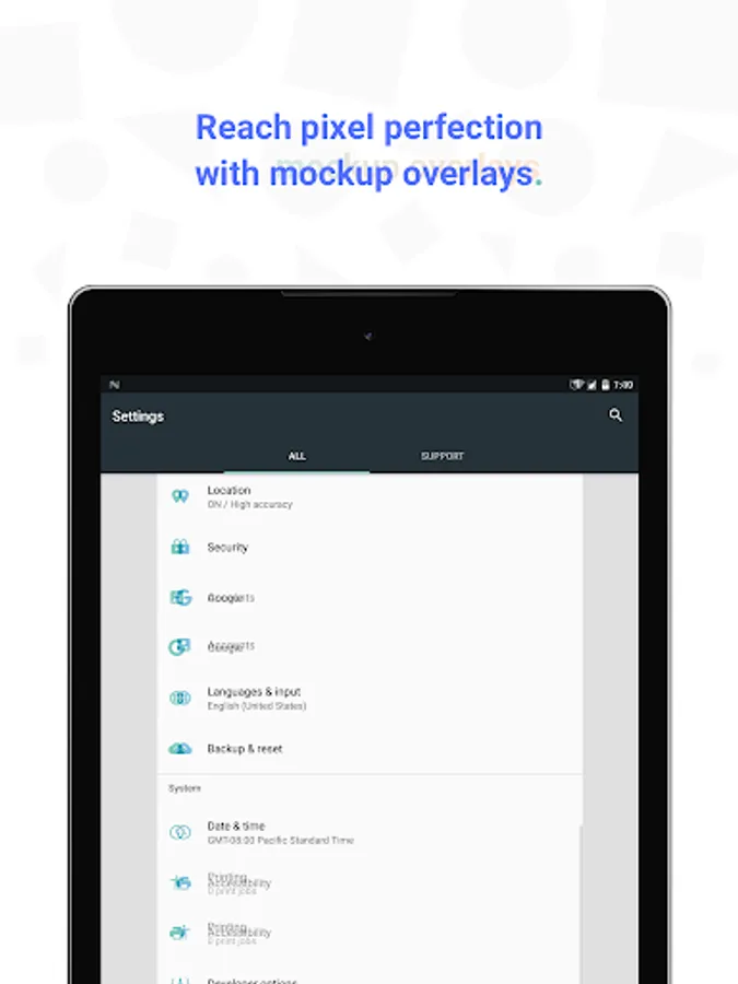 Mockup Overlay - Display a mockup image over your app. This gives you a high-fidelity opportunity to see how the design spec matches the developed user interface. Choose from portrait or landscape overlays and tune the opacity for an effective comparison.