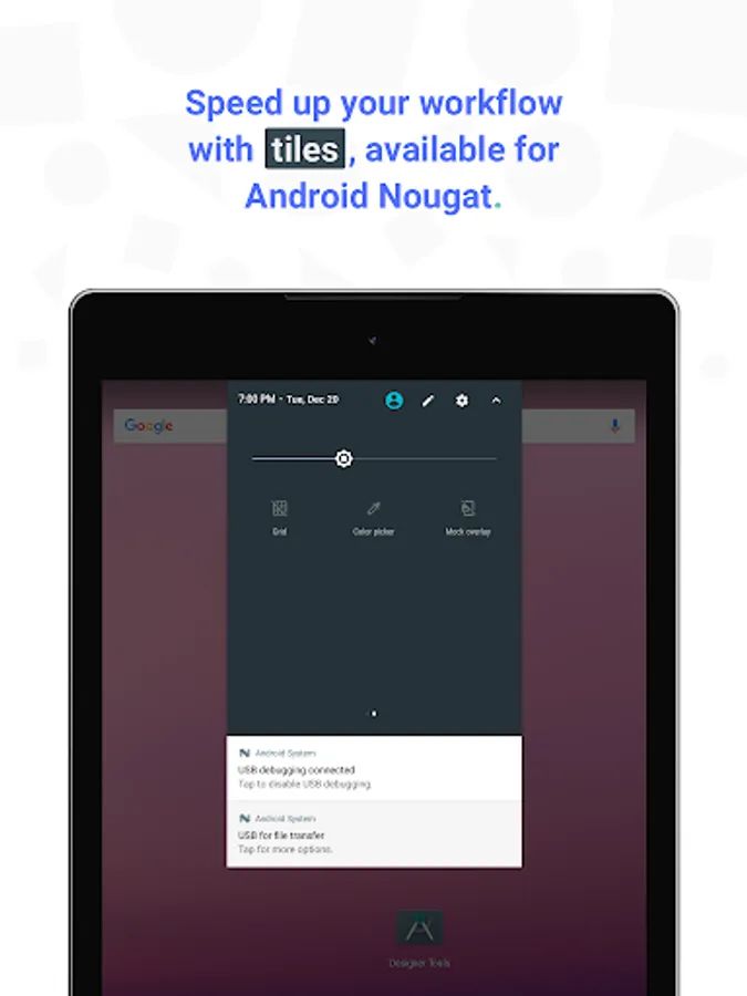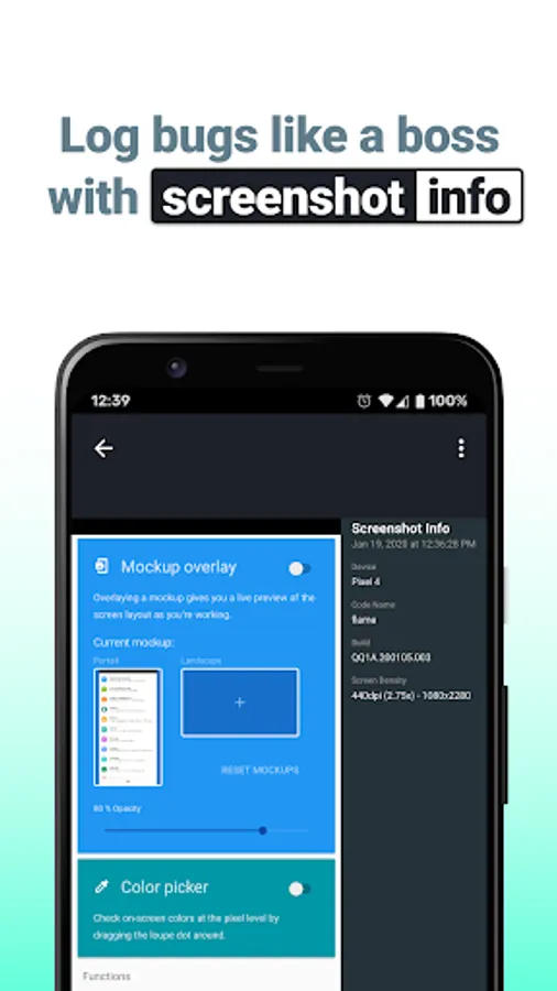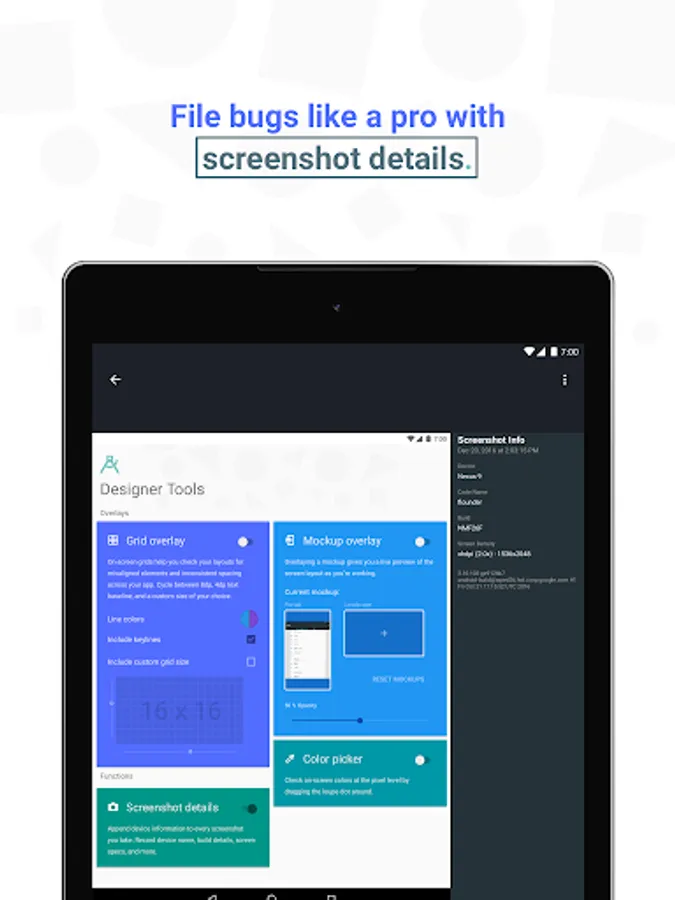 Screenshot details - Add a panel to all of your screenshots that displays information regarding the device, screen and Android version. QA teams will LOVE this.