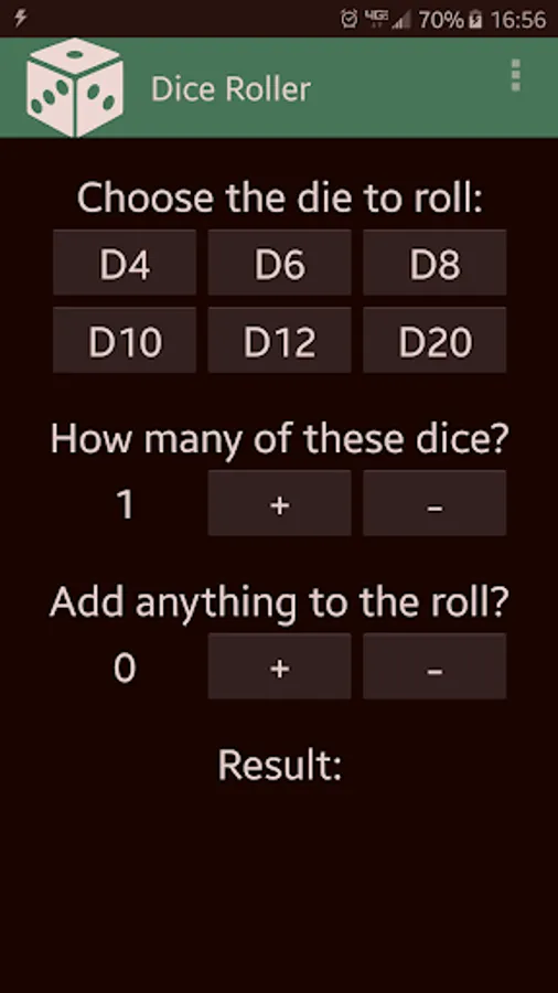 This is a small app that simply allows you to roll any of the common polyhedral dice (d4, d6, d8, d10, d12, and d20). It uses basic random number generating functionality. Try it out!