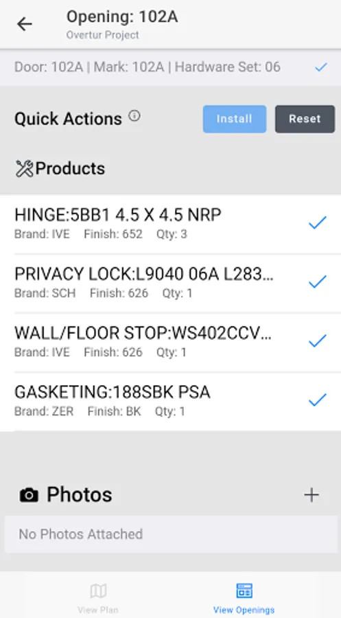 The Installation tool allows users to mark the hardware items that are installed for an opening, or the opening itself, as they proceed through a project installation. Users can add notes, take photos, attach pre-snapped photos, or add voice memos to document their work at the time of installation.