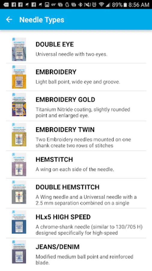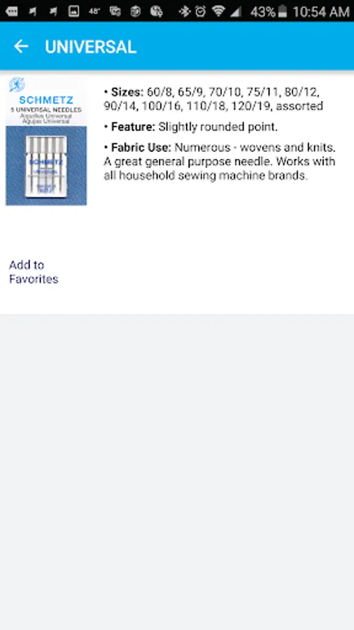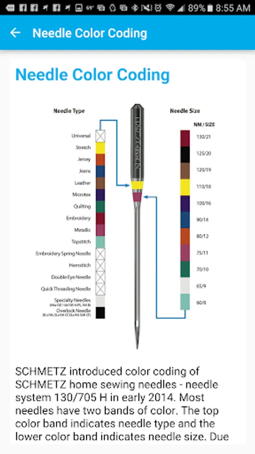 This app is created by Euro-notions, Inc. for household sewing machine needles in the North American Market. Based on the ever popular SCHMETZ ABC Pocket Guide, this app provides a comprehensive reference to SCHMETZ needles for household sewing machines. Includes updated color code information. This app helps you choose the correct needle for your sewing application. Increase your sewing skill by learning about the various types of needles available. Learn to spot the signs that it might be time to change your sewing machine needle. Use this app to sew better with SCHMETZ!