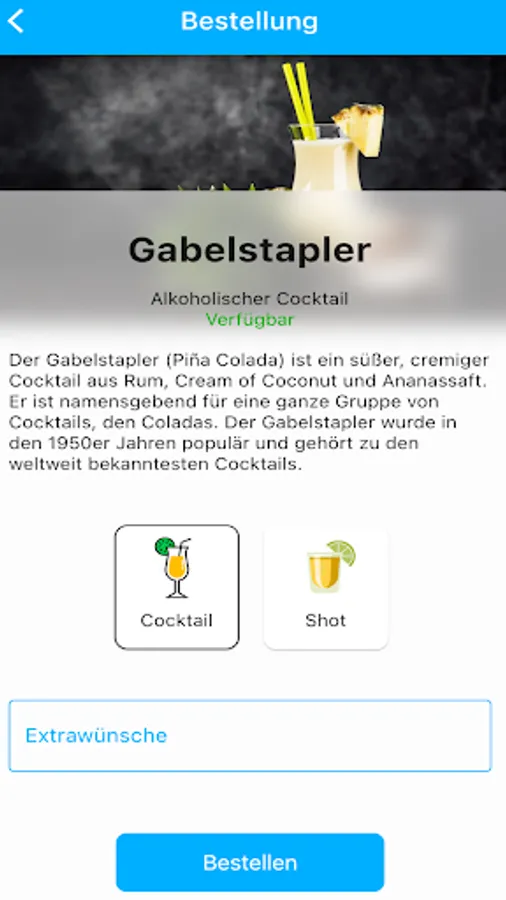 Our app offers numerous handy features such as the ability to save your orders, get random suggestions for your next cocktail and choose your desired size. You can save your favorite cocktails in your favorites and always know what you love.
