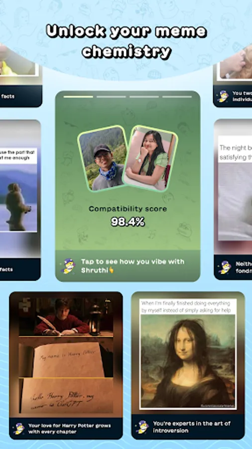 - Swipe through our handpicked memes as the algorithm creates your humor profile.