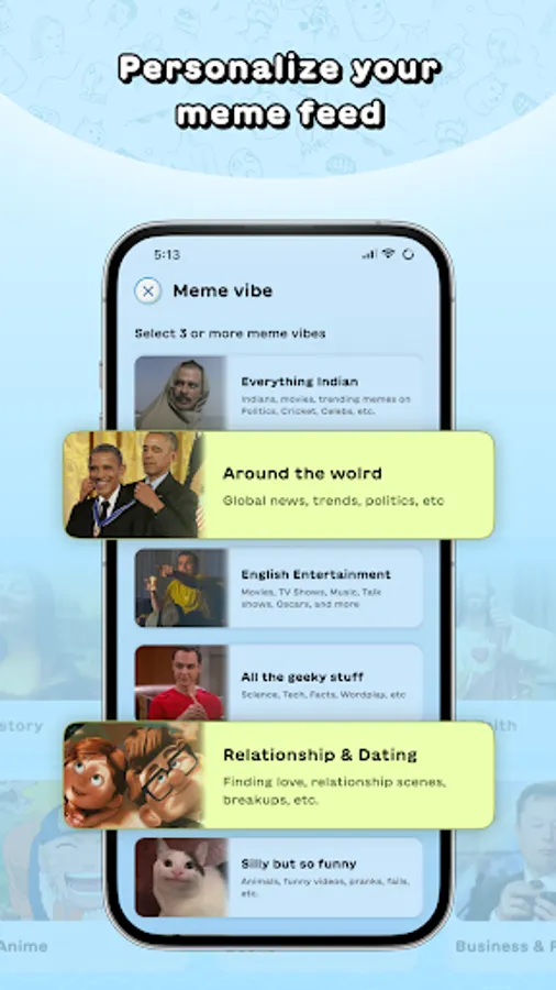 - Pick your "meme-vibe" by selecting your favorite content themes.