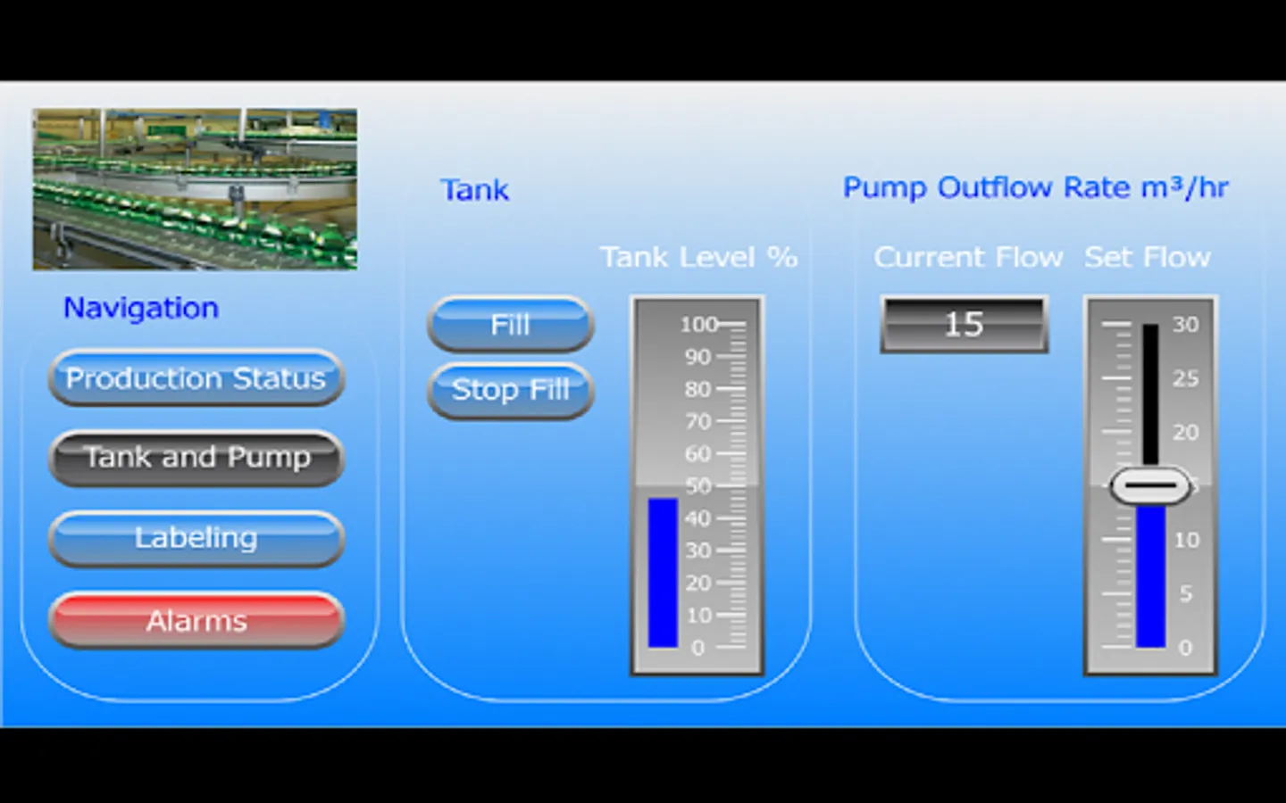 You can use Vijeo Designer’s drawing tools to create and edit a visual representation of the automation process. You can draw shapes and parts (such as rectangles, arcs, pies, numeric displays, switches, and bar graphs), use the gradient feature to enhance the color of the drawn objects, and set up an Alarm Panel for remote alarm monitoring and interaction.