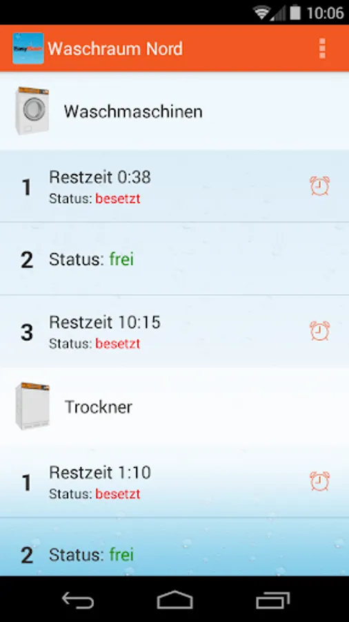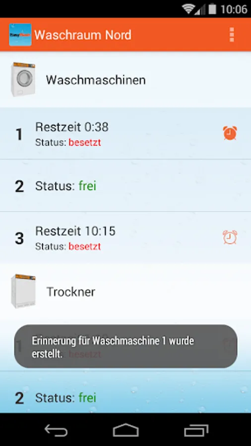The EasyWash app allows online availability check for washers and dryers. Besides the availability query returns information about the expected remaining life time of the machine. With the memory function obtained by a simple marking machine automatic notification when your own laundry is done or a machine becomes available again.