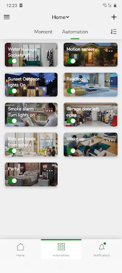 Example: When you leave home, select the preset “Away” moment button to turn off all devices, when you get home select ‘Welcome’ to turn on devices, such a lights and AC.