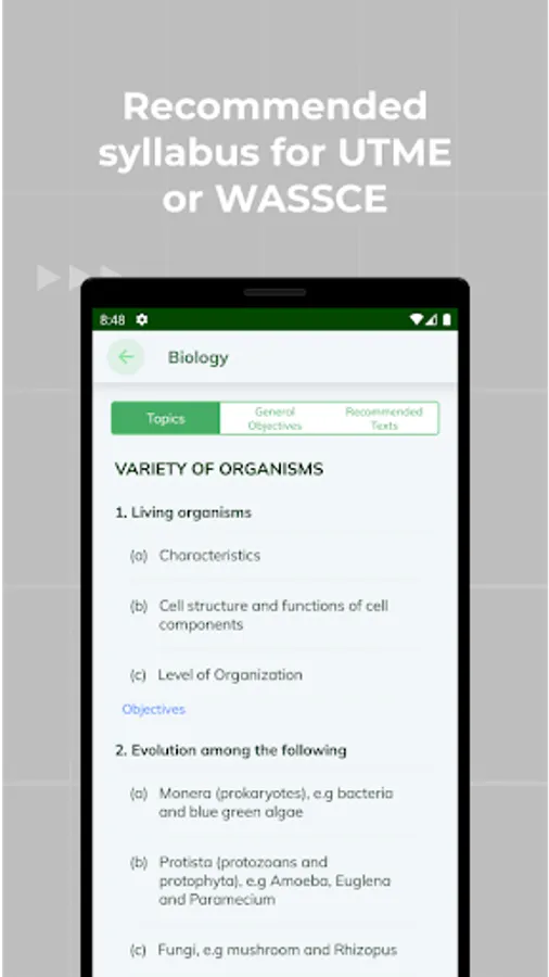 The application contains detailed and well explained questions, answers and solutions to real JAMB past exams to enable students confidently sit for UTME, pass the exam and then gain admission to the institution (University, Polytechnic or college of Education) and course of their choice all in ONE SITTING.