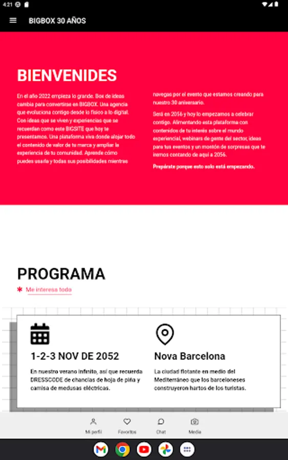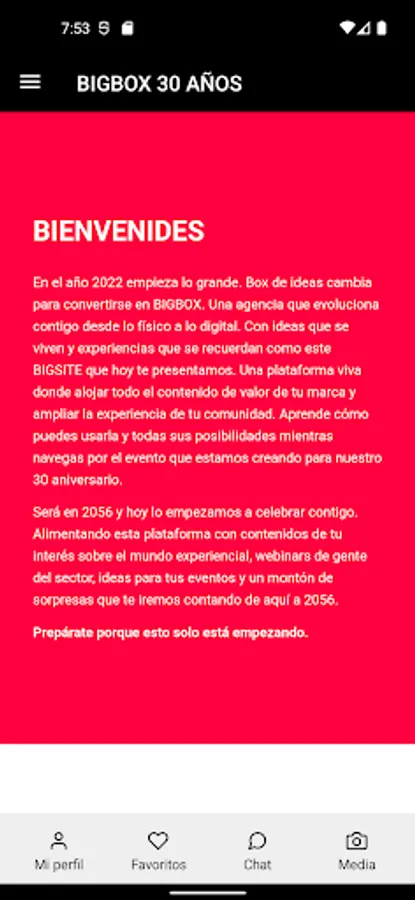 In the year 2022 the big thing begins. Box of ideas changes to become BIGBOX. An agency that evolves with you from the physical to the digital. With ideas that are lived and experiences that are remembered like this BIGSITE that we present to you today. A live platform where you can host all the valuable content of your brand and expand the experience of your community. Learn how you can use it and all its possibilities as you browse the event we're creating for our 30th anniversary.