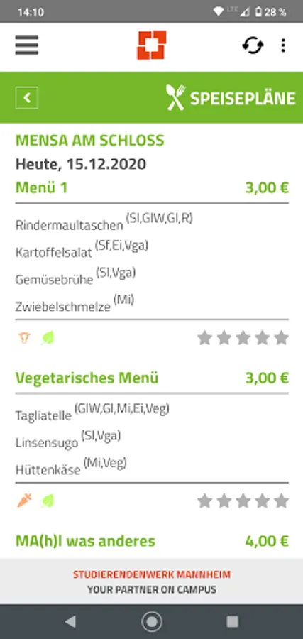 - Canteen menus: From the kitchen directly to your own app - it couldn't be more up-to-date! Extra features: With the StudiPlus²® you can filter the menus in the canteens at the Mannheim universities according to numerous criteria (allergens, vegan, vegetarian, no pork etc.) and of course also evaluate them directly.