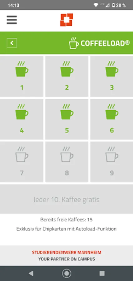 - Coffeeload® stamp card: Register once and automatically receive every 10th coffee at the machine for free (exclusively for chip cards with autoload function).