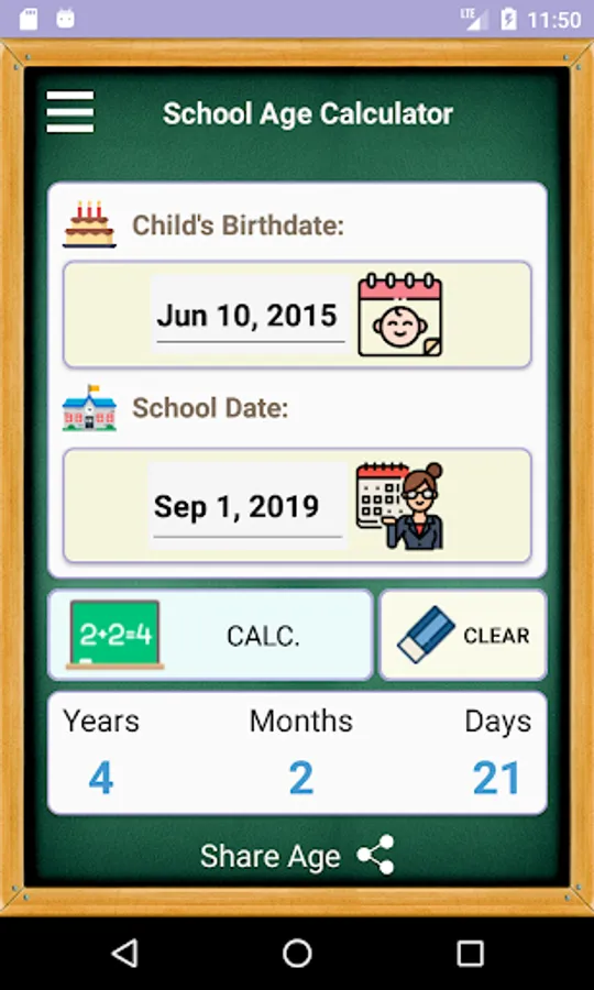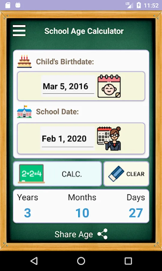 "School Age Calculator" is a useful app to answer the common question in every school application form for admission "What is your child's age on school start date in (Years, Months, Days) ?".