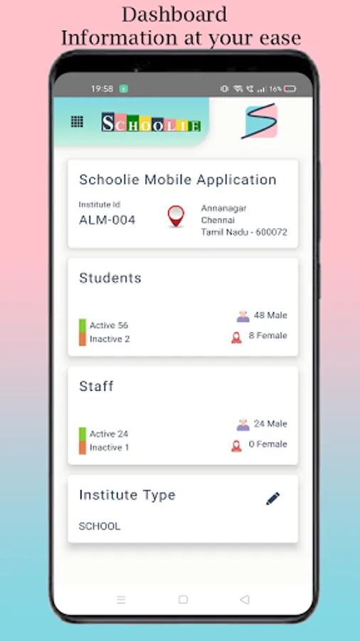 Schoolie is Android Mobile application developed to benefit institution's run by individual's to large corporate in the field of education. It offers unmatched end to end solution to manage the student, staff and administration completely digital. It is also a platform for high quality online education.