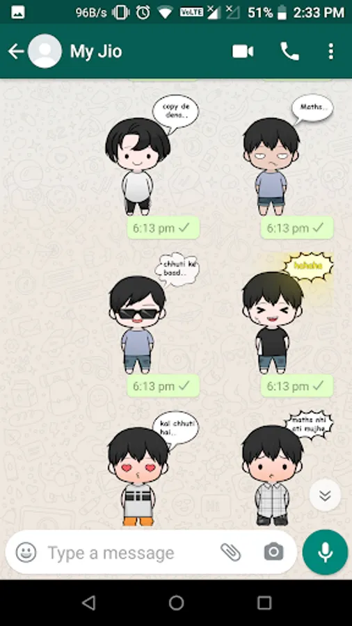 School Talk stickers is a free stickers app for WA with awesome face reaction like: smile, angry, confuse, sad, and surprise ETC. This school talk app offers a variety of beautiful cute, happy stickers, anime stickers that make you're chatting more interesting and funny. You will really enjoy expressing your feeling and emotions with this free sticker app.