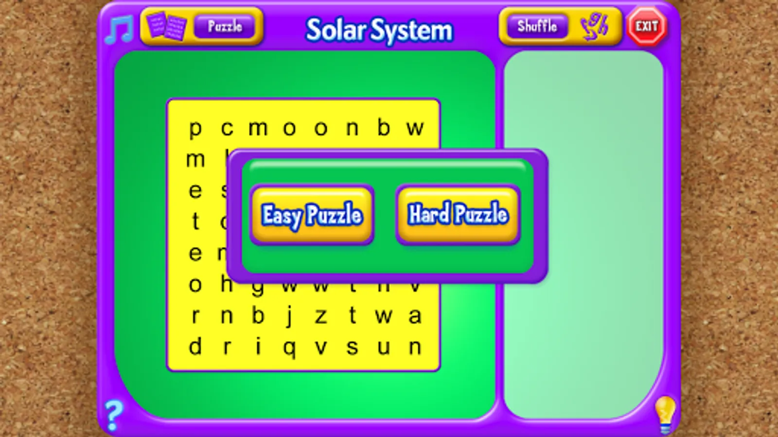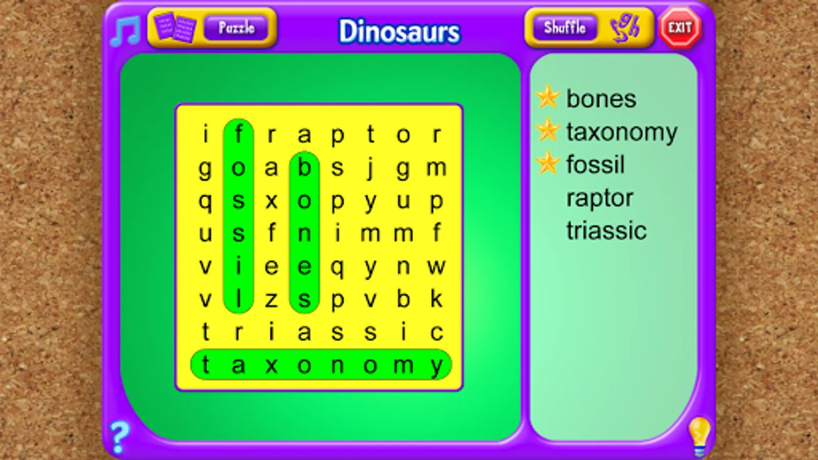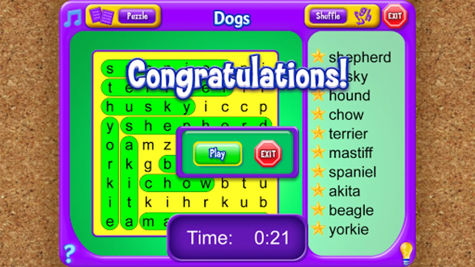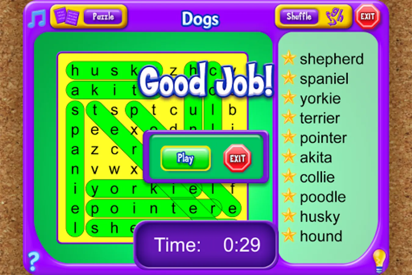 Can you find the word kodkod? A combination of familiar and exotic words both reinforce and expand vocabulary, as players race against the clock in this Word Search app. Players select “Puzzle” to choose from one of twelve themes that include Wild Cats, Endangered Animals and Musical Instruments. Players pick the easy or hard (5- or 10-word) version, with word complexity ranging from one to four syllables. A word list will appear onscreen at right. After finding one of the words in the puzzle, players can either tap the first and last letter of the word or swipe across it, up and down, or diagonally. Earn a star for each word found. Choose “Shuffle” to change the word list and re-scramble the puzzle at any time. Tap a word in the list to hear its pronunciation. Select the lightbulb icon if you need a hint. Choose the question mark if you need to hear the instructions again. This game sharpens focus, word recognition and spelling. The app can also help give adult brains a quick and easy workout.