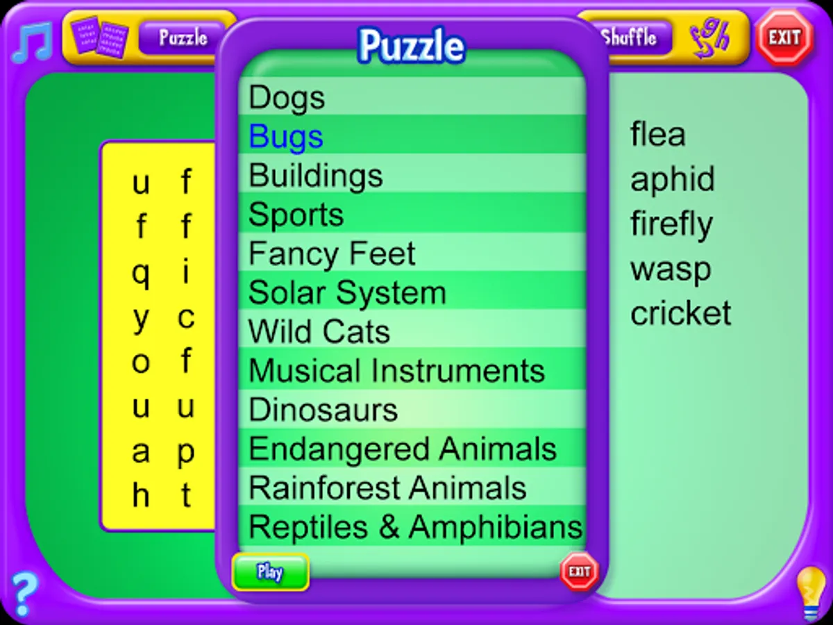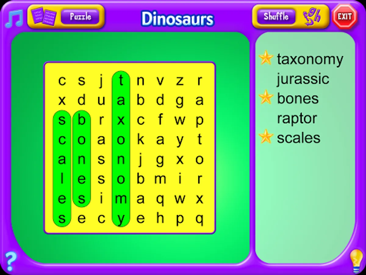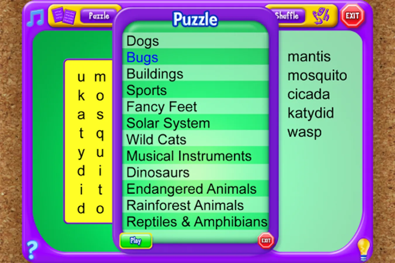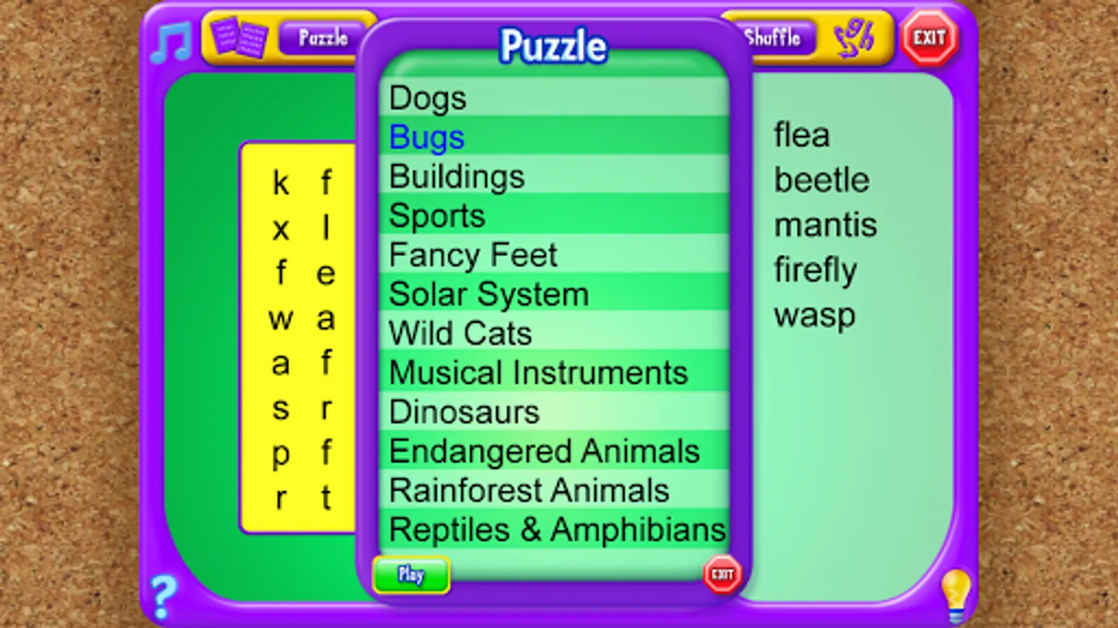 Can you find the word kodkod? A combination of familiar and exotic words both reinforce and expand vocabulary, as players race against the clock in this Word Search app. Players select “Puzzle” to choose from one of twelve themes that include Wild Cats, Endangered Animals and Musical Instruments. Players pick the easy or hard (5- or 10-word) version, with word complexity ranging from one to four syllables. A word list will appear onscreen at right. After finding one of the words in the puzzle, players can either tap the first and last letter of the word or swipe across it, up and down, or diagonally. Earn a star for each word found. Choose “Shuffle” to change the word list and re-scramble the puzzle at any time. Tap a word in the list to hear its pronunciation. Select the lightbulb icon if you need a hint. Choose the question mark if you need to hear the instructions again. This game sharpens focus, word recognition and spelling. The app can also help give adult brains a quick and easy workout.