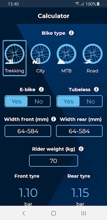 - Tyre pressure calculator feature allows you to calculate optimal pressure for your bike type