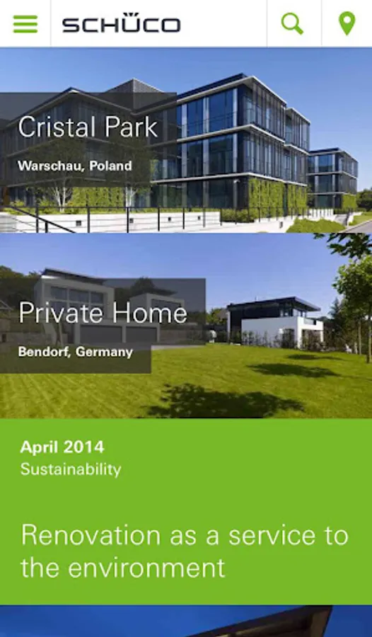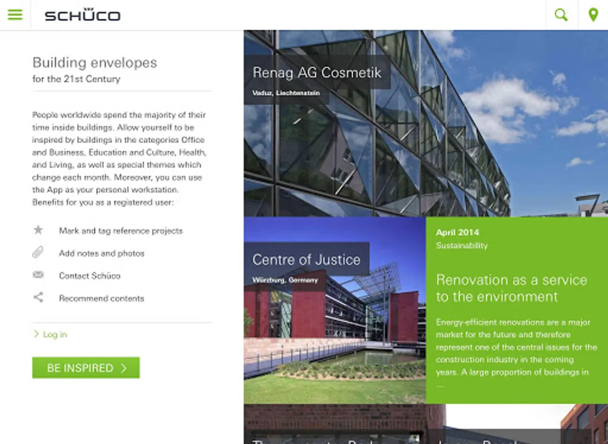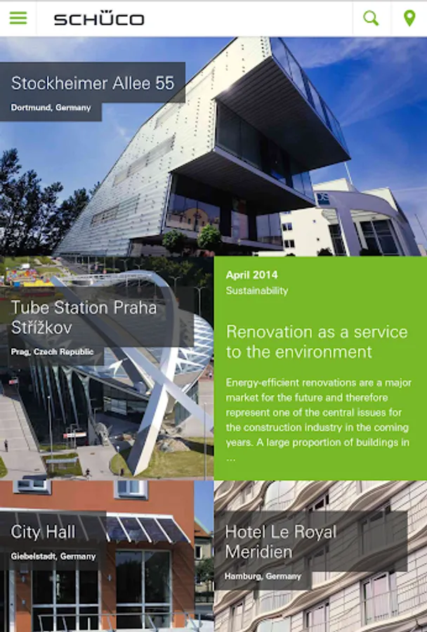 Together with its worldwide network of partners and architects, Schüco creates sustainable building envelopes. Schüco has now developed an App which provides you with inspiration and all the information you need about the industry. Browse through the international reference projects that interest you, receive a notification when you are near a Schüco project, or use the App during customer presentations.