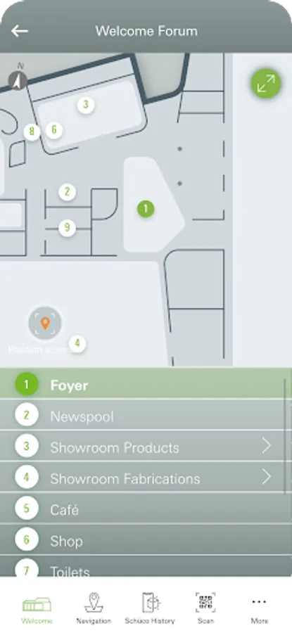 Overview of the Welcome Forum: To help you find your way around the site, the app includes a site plan of the different rooms in the Welcome Forum including lists of the exhibits and a map of the new Schüco Campus. Use the app to scan the QR codes on stands on-site for further information.