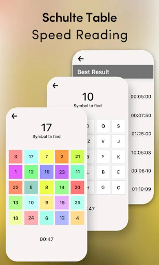 ✔️Numbers and Characters Table: You can get Numbers and characters tables in the Schulte table and speed-reading app.