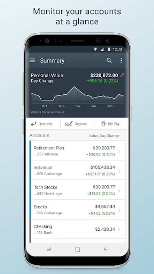 • See your account balances (including non-Schwab accounts), assets, and performance in one place.