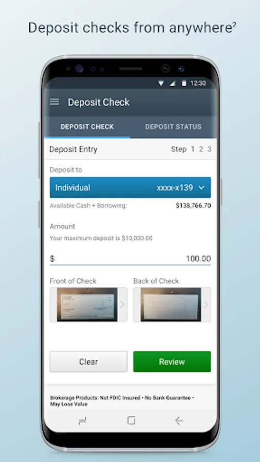 4. The Schwab Mobile Deposit service is subject to certain eligibility requirements, limitations, and other conditions. Enrollment is not guaranteed, and standard hold policies apply. See Schwab.com for more details.