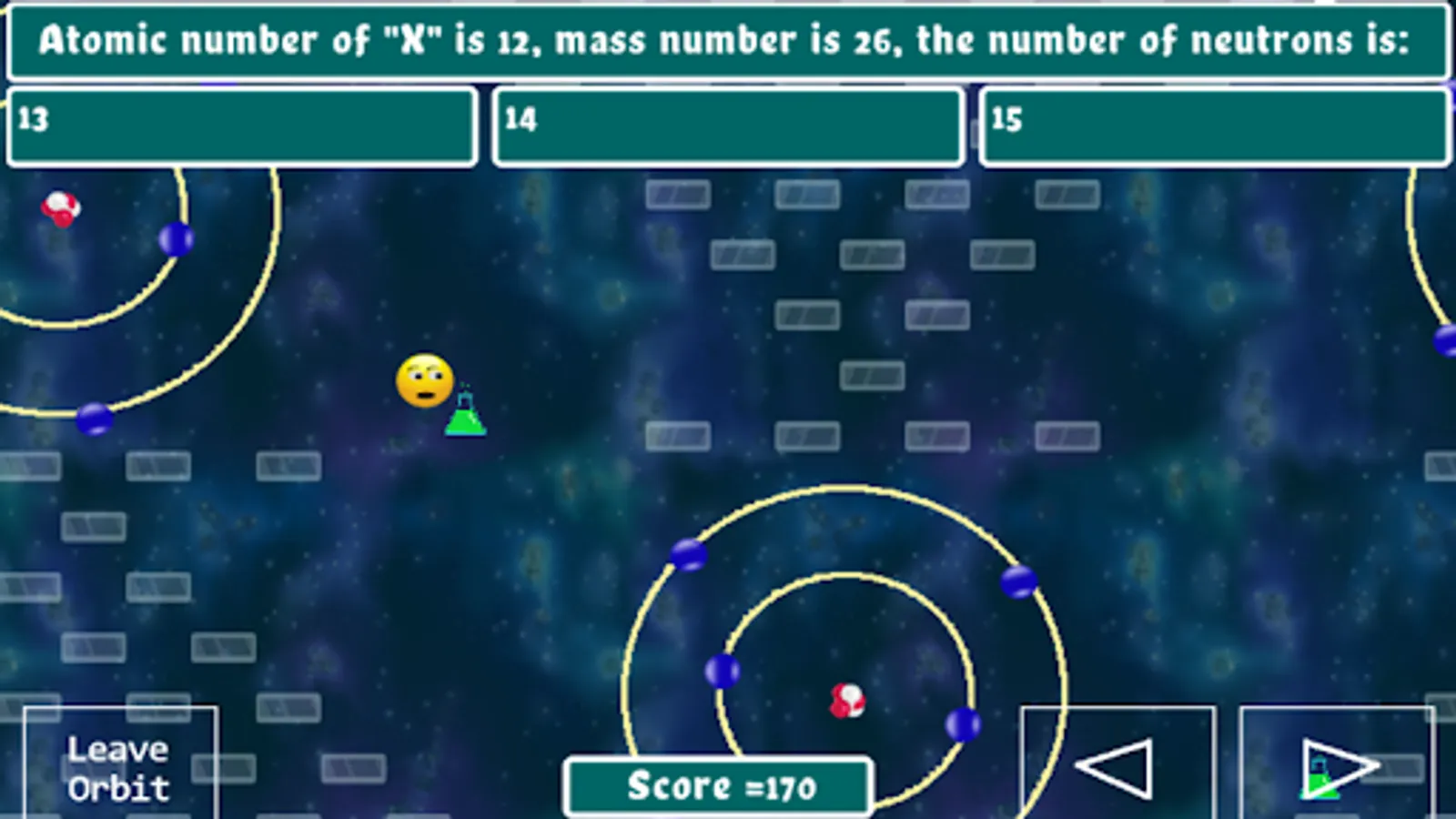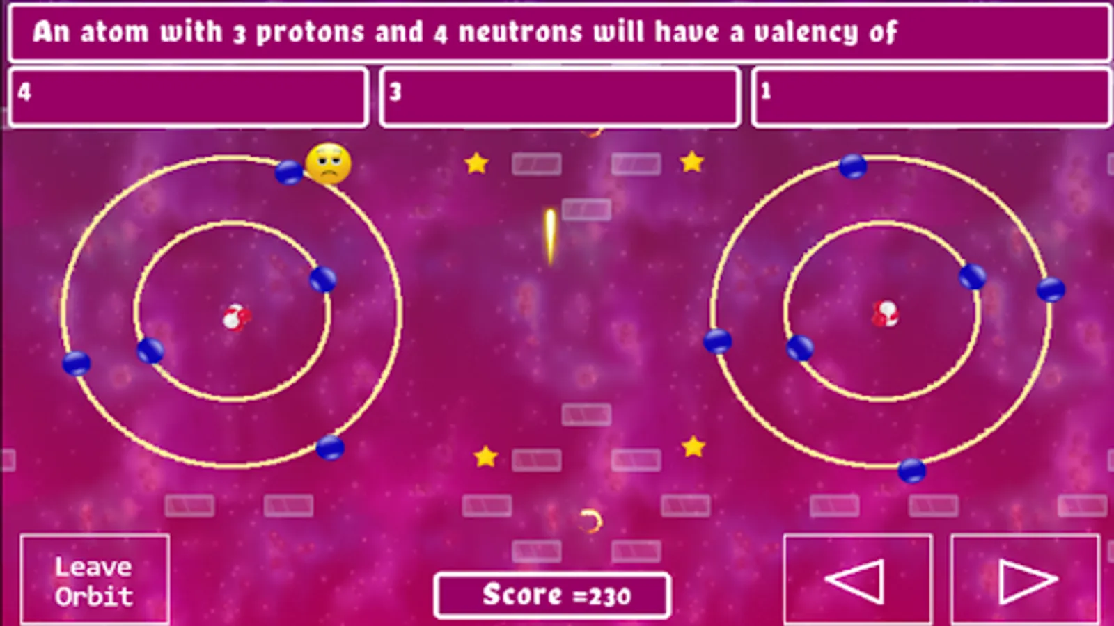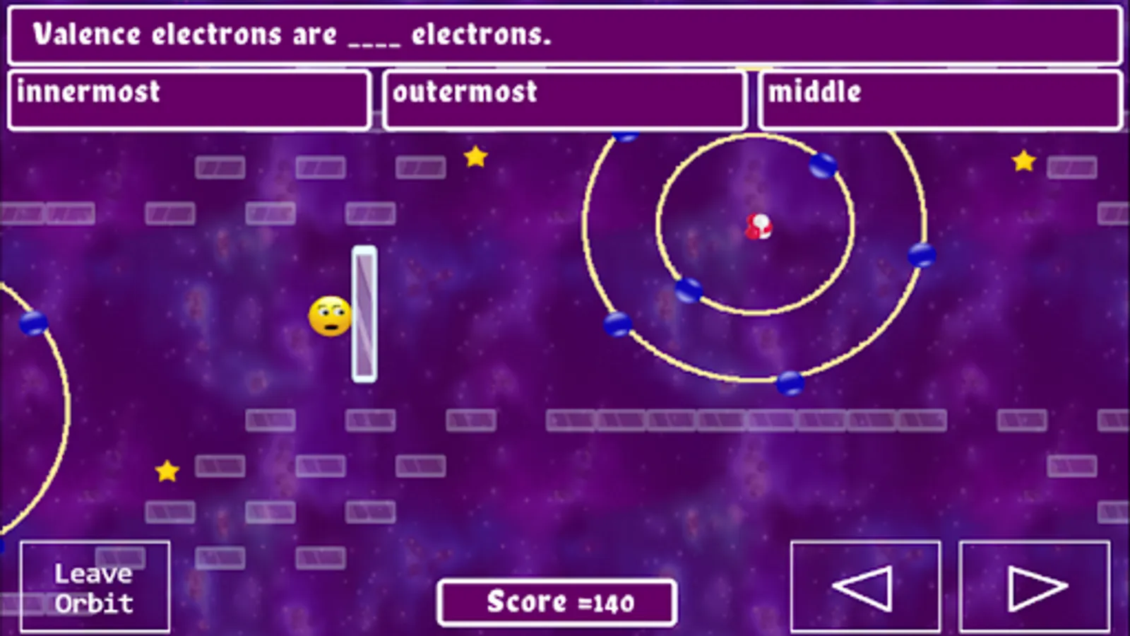 This atom game is an action platformer where you have to cross multiple levels riding on atomic orbits. If you collide with an electron you have to answer a quiz question in order to continue. The questions are on atom structure with focus on