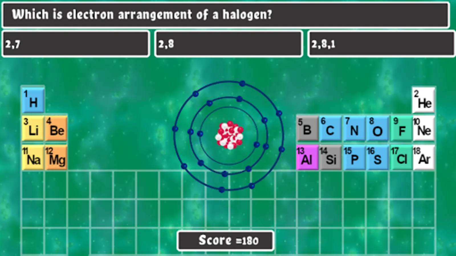 In another level you have to answer questions on the periodic table and create the first 20 elements of the periodic table. Observe the electronic configuration of each atom being created. Answer questions on