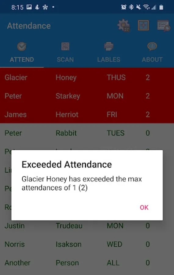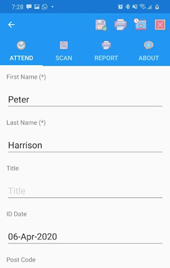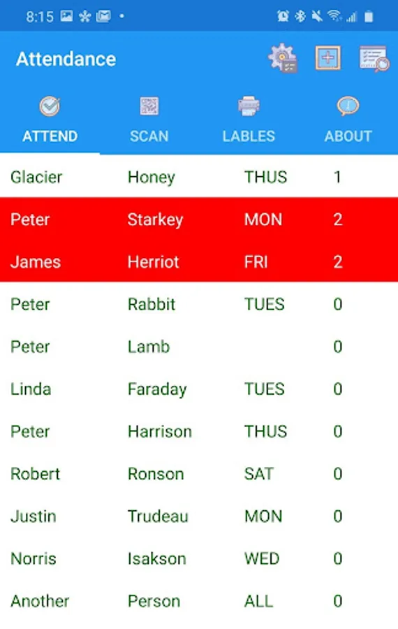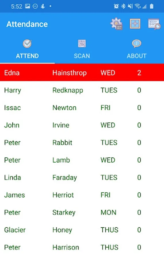 This uses a QR / Barcode reader to scan a simple card and record if a cardholder has already attended, or check if someone hasn't attended. Uses a cloud database so you can have more than one device. Also available on the Apple thingy.