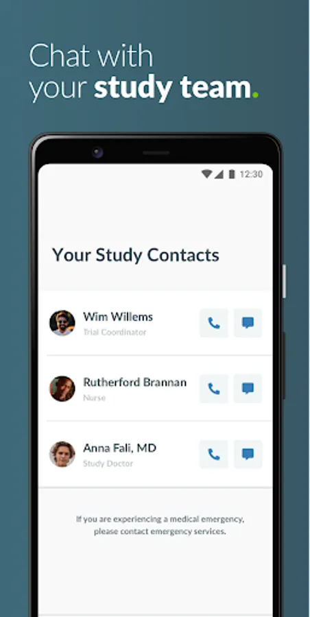 - Chat directly with your study team using your preferred method, including text messaging, phone calls, and video chats.