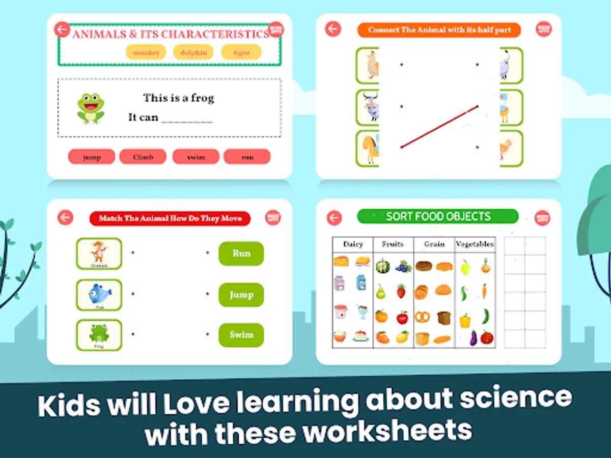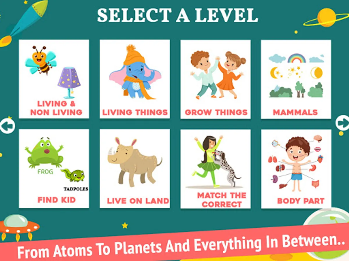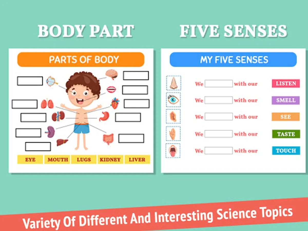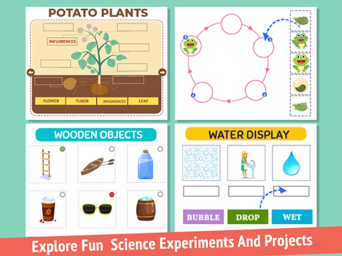 Welcome to our sci hub where you can find more than 30 science learning levels. Kids can Learn about Water Cycle, Living-Non Living things, Seasons, Planets, Solar System, Body Parts, Zoology , Human Body, Senses, Animals, Animal Bodies, Environmental science, Animal Sounds, Plants, Food and Nutrition, social science, computer science and many more subjects. Get new ides for your next science project.