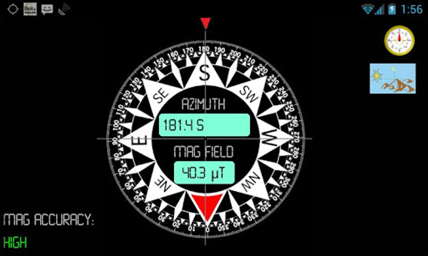 'Surveyor Tools Free' includes three screens: the main screen and two different compass screens. One is a simple compass that is like a traditional compass with a moving needle. The other compass is more modern and displays a number of useful datums. These include azimuth angle with bearing and magnetic field strength, as well as the magnetic field data accuracy.
