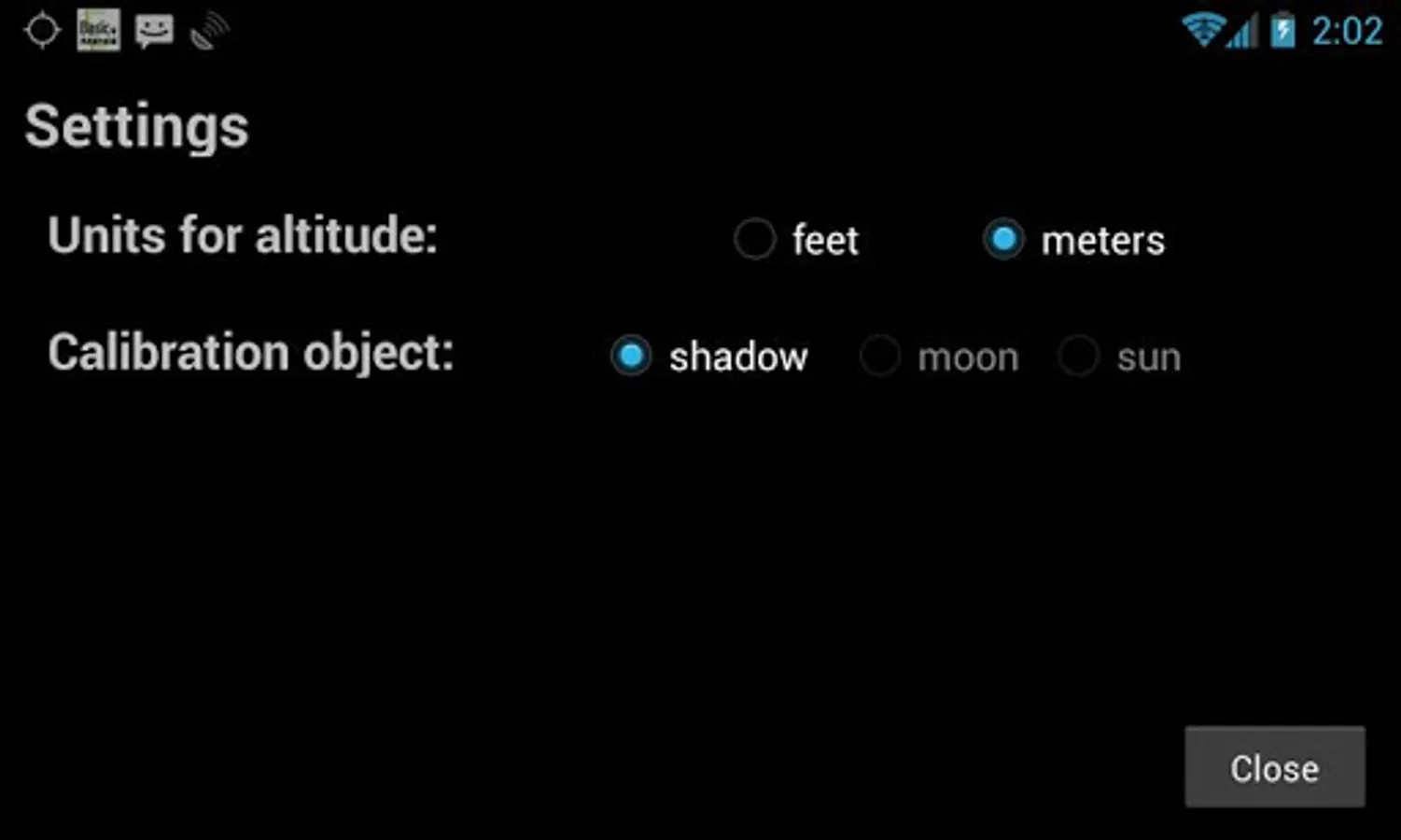The 'CAL' button on the main screen is the calibration button. If you have not yet calibrated 'Surveyor Tools Free', the button will appear green. To calibrate 'Surveyor Tools Free' first select the object you want to calibrate with on the settings screen (Moon, Sun, Sun's shadow). Be careful when pointing at the Sun; use the Sun to calibrate only when it is cloudy and you can still see the Sun through the clouds.