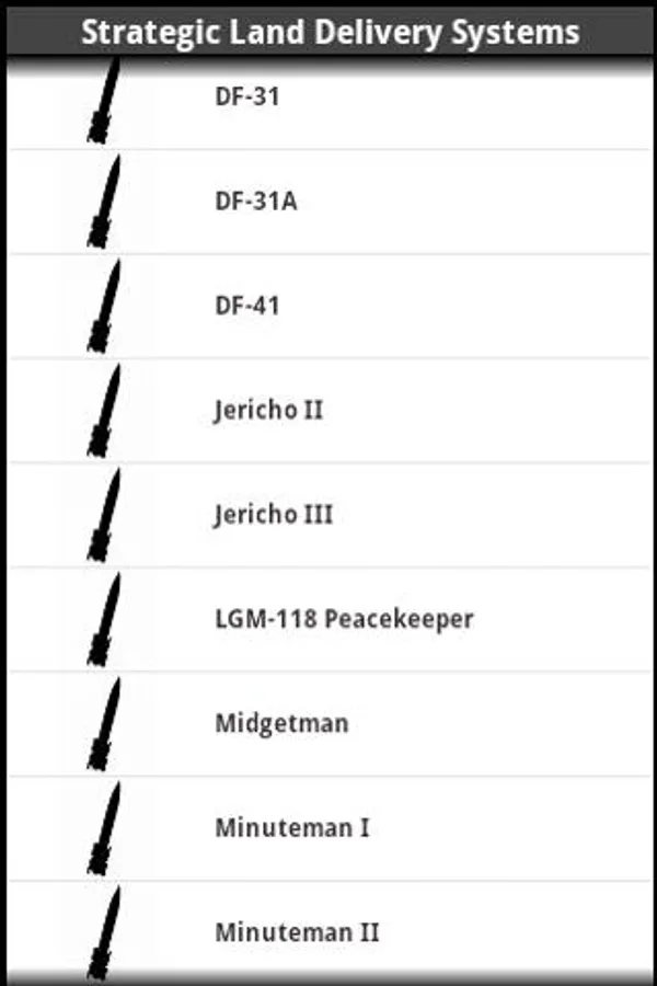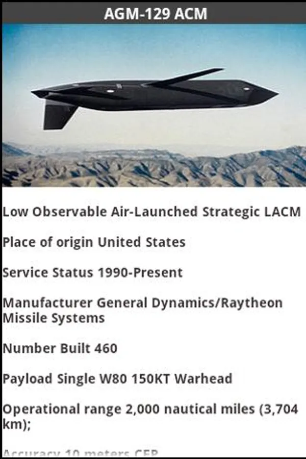 The encyclopedia section of the app, provides a superb database of Nuclear Delivery Systems such as ICBMs, SLBMs, and Cruise Missiles. The sections include Core Nuclear Wafare concepts, Land-based Nuclear Weapons, Sea-based Nuclear Weapons, Special Mission Nukes. Each weapons system profile includes information such as a vivid color photo, specific role, country of origin, date of introduction, number built, unit cost, range, payload, guidance system, and more.