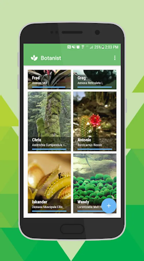 You can add plants from more than 4000 available species in Botanist database, water and fertilize them, record their heights and picture them in different stages of growth!