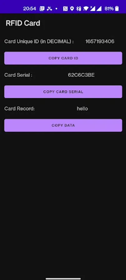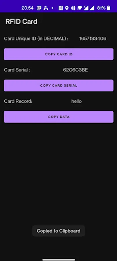 using this app you can read RFID Card unique id, serial and data. Very easy to use. You can copy id, serial and data to your clipboard separately.