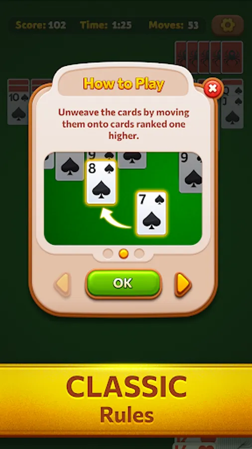 🕷️ Boosters: Not sure what your next move should be? Use the ‘hint’ booster to make things easier. Regret your last move? No problem. Use the ‘Undo’ booster to take it back.