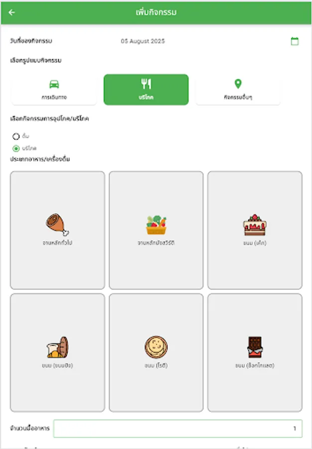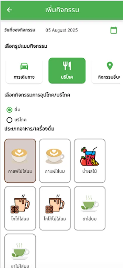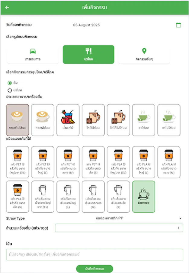 Consumption Tracking: Beyond travel, the app also tracks CF emissions from your daily food and beverage consumption. You can record the number of meals consumed, the types of food or beverages consumed, and the packaging used, such as plastic cups or water bottles, all of which contribute to your carbon footprint.