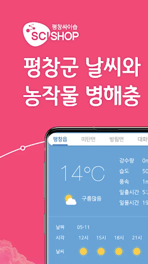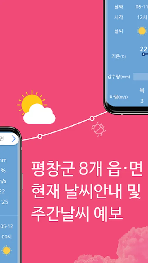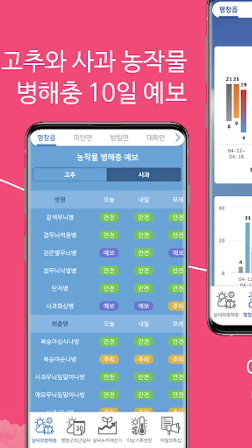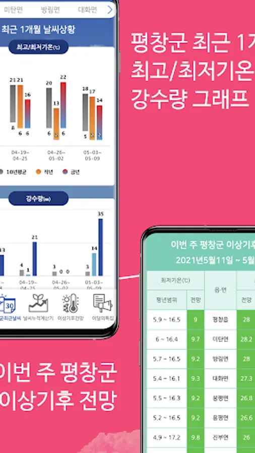 'Weather in Pyeongchang-gun and Pests and Pests in Pyeongchang-gun' was created with the purpose of providing weekly information on the occurrence of major crops and pests by utilizing detailed meteorological information in each town and village of Pyeongchang-gun.